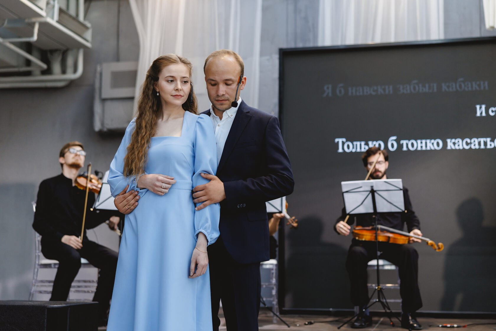 Гости услышали волшебное соединение есенинского слова и неоклассики в исполнении композитора Андрея Синецкого с участием артистов театра «Переход» имени Геннадия Кириллова и ансамбля «Доминанта».