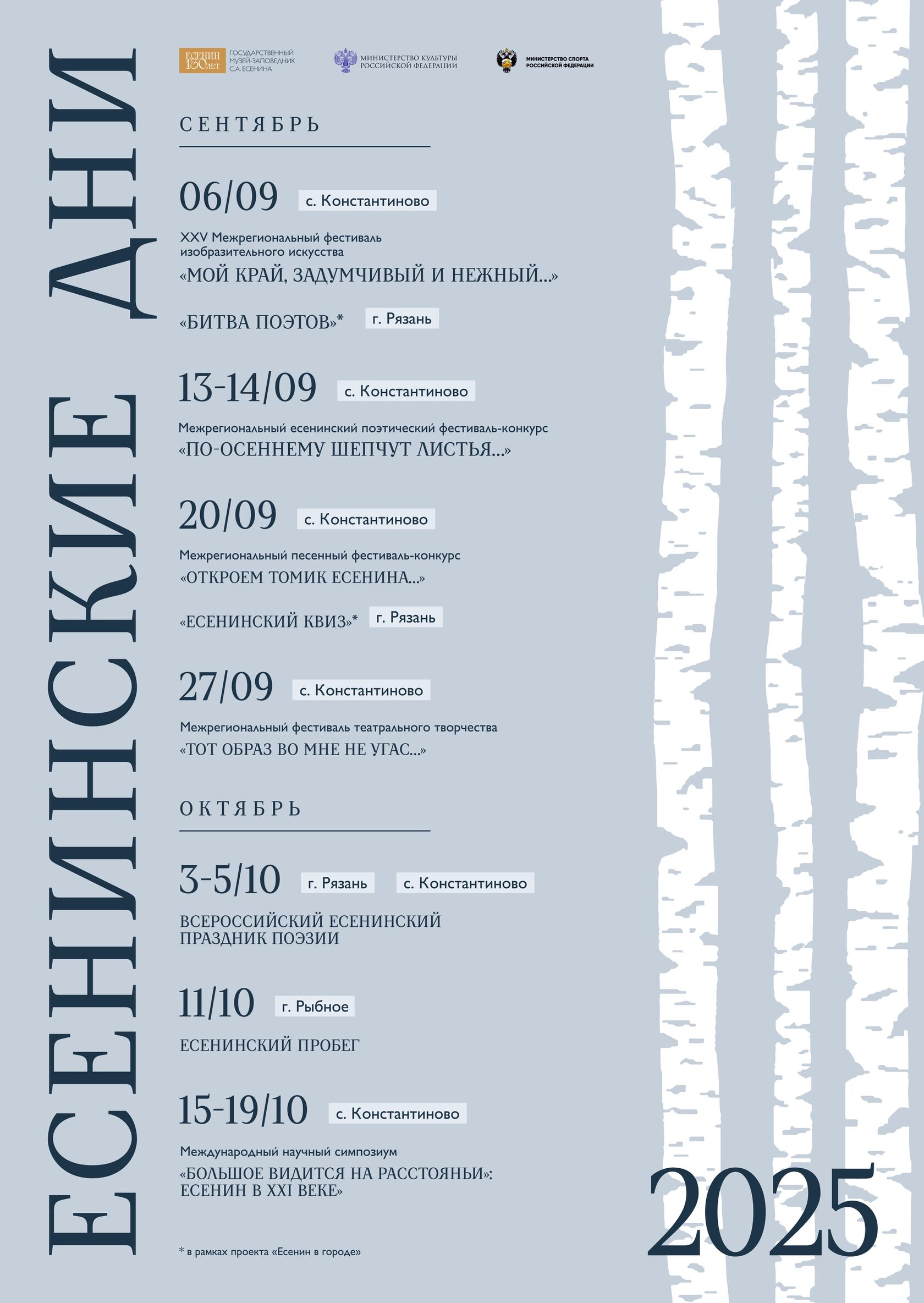 В начале осени в музее-заповеднике по традиции начнутся «Есенинские дни», приуроченные к 130-летию великого поэта. Сентябрь станет настоящим фестивальным месяцем. Каждые выходные будут проходить межрегиональные творческие конкурсы. Это отличный повод приехать в село Константиново, которое станет точкой притяжения для художников, музыкантов, поэтов, чтецов, актеров и всех, неравнодушных к творчеству Сергея Есенина.