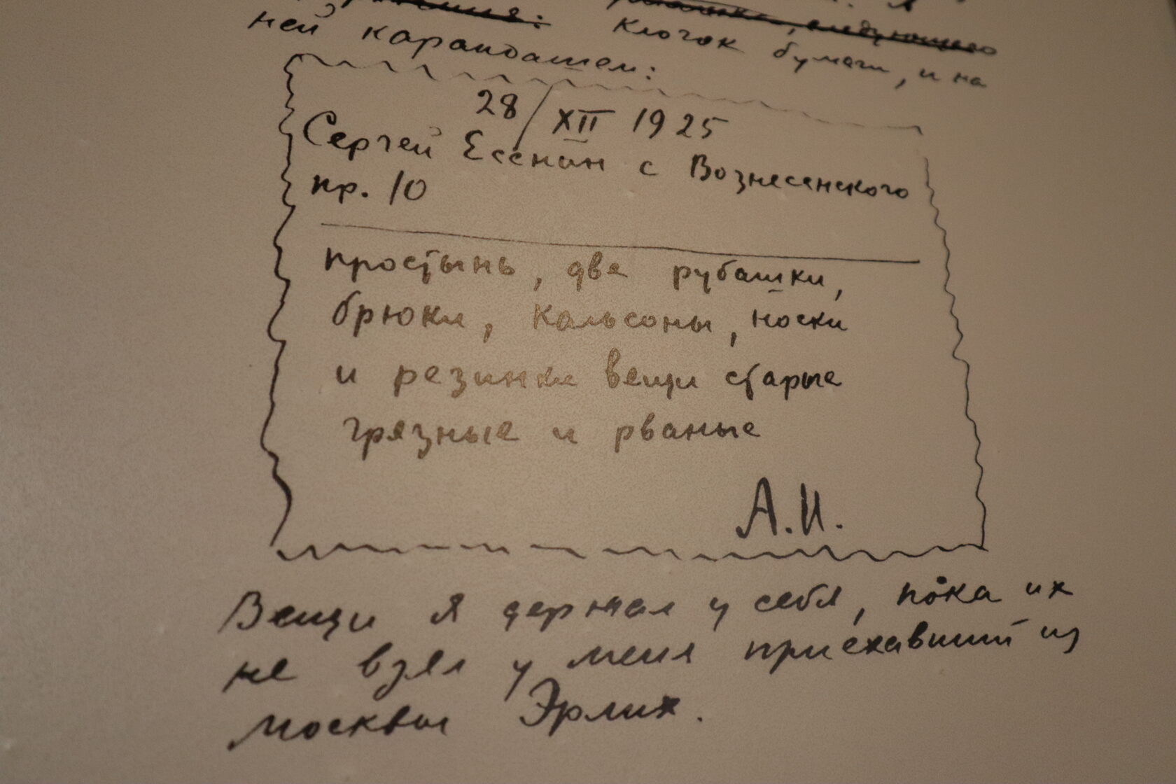 Переступив порог выставочного зала, словно попадаешь в машину времени и погружаешься в загадочное прошлое, читаешь свидетельства близких людей и знакомых великого поэта, письма и дневниковые записи. Перед глазами проносятся ключевые события последнего года и особенно последних дней жизни Сергея Есенина, и ощущается его эмоциональное состояние.